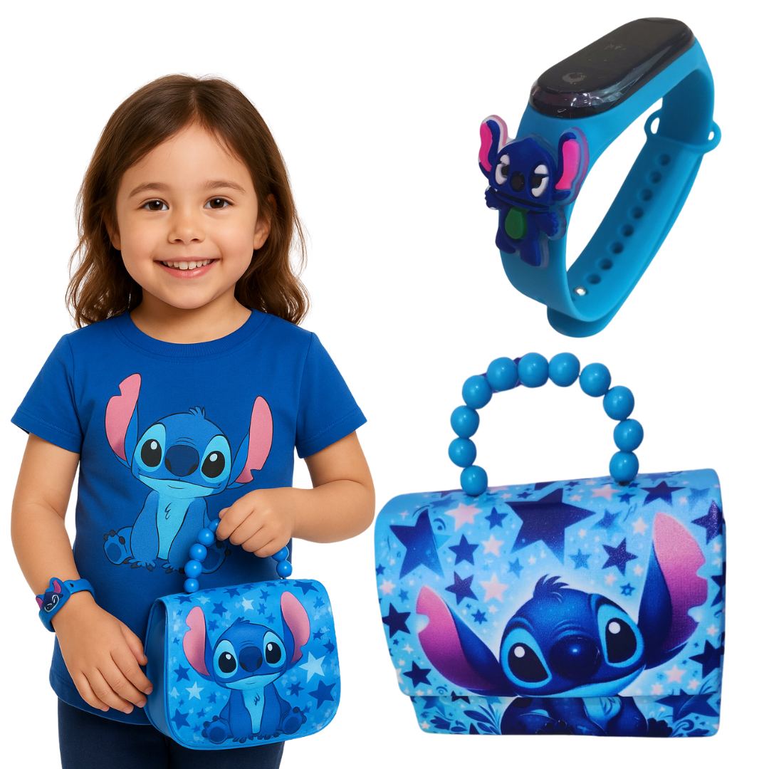Deixe o dia da sua pequena mais divertido e estiloso com o **Relógio Infantil Digital do Stitch**, acompanhado de uma linda **bolsa temática para meninas**. Inspirado no personagem adorável e travesso de **Stitch**, este relógio traz cores vibrantes e um design lúdico, perfeito para combinar com o dia a dia da sua filha.